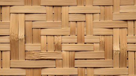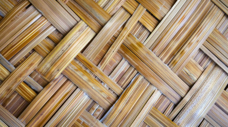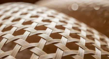 Intricate close up of woven bamboo texture, highlighting natural fibers, light brown color, and a complex geometric pattern with intersecting strands.