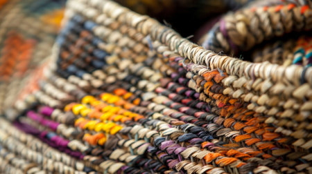 A closeup of a basket woven from natural fibers intricately designed with a mix of vibrant and neutral tones