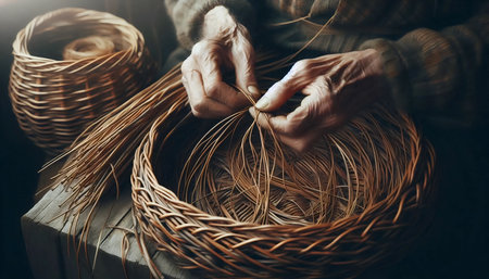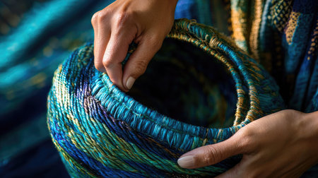 A close-up view of hands crafting a vibrant handwoven basket, showcasing intricate patterns and textures. This image highlights the beauty of traditional weaving techniques.