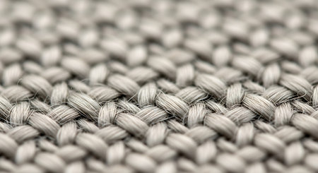 A detailed macro view of a grey woven fabric, showing the intricate pattern of interlaced threads.