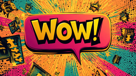 Bold speech bubble expressing wow surrounded by colorful patterns and discount prices, creatively designed in pop art style to grab attention.