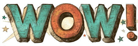 Vibrant lettering spells WOW in bright colors, surrounded by stars, creating an energetic and eye-catching display ideal for decorations or graphics.