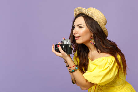 Beautiful young girl in yellow dress hat taking picture on retro vintage photo camera looking aside isolated on pastel violet background. People sincere emotions lifestyle concept. Mock up copy space