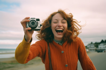 young happy and beautiful red hair woman with vintage camera having fun on the beach enjoying holidays travel and vacations in Europe having fun
