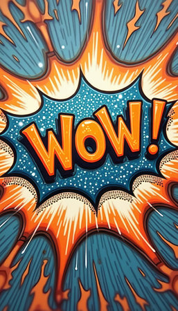 A vibrant comic book explosion bursts forth, featuring the bold word WOW in striking orange letters against a dazzling blue background. This eye-catching design radiates energy and excitement, perfect for conveying surprise and enthusiasm in various creative projects.