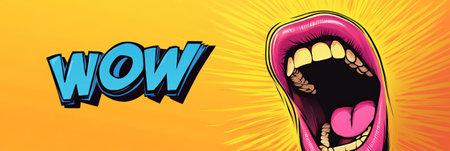 Pop art comic book style illustration of a womans open mouth with pink lipstick and tongue, shouting wow, on a yellow radial burst background