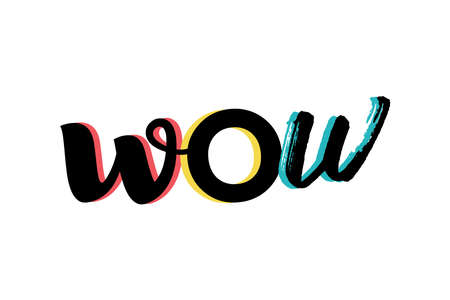 Modern, playful, bold graphic design of a word wow in red, yellow, blue colors. Handwritten, brush stroke style typography.