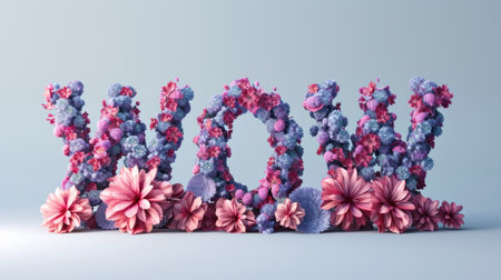 Text WOW made of mixed purple and pink flowers on a pale blue background