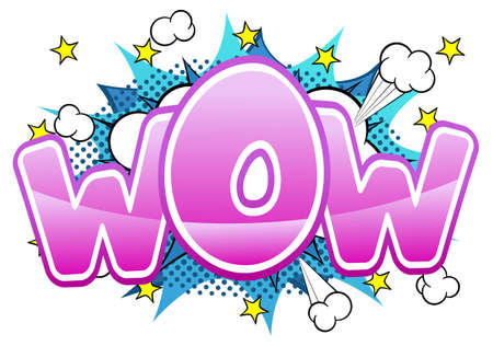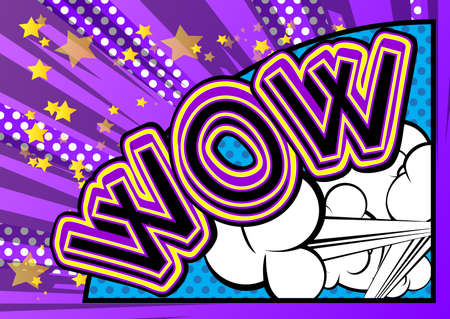 Comic book Wow word effect on bright abstract background. Vector cartoon illustration in retro pop art style. Comics text sound effects.
