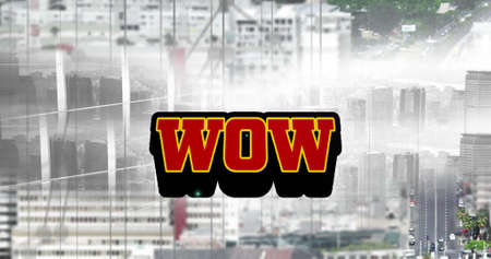 Image of wow text over cityscape background. image game, digital interface and communication concept digitally generated image.