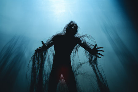 Ghostly figure looms in the dark. Swirling mist. Eerie atmosphere. Ghost drapes a flowing, translucent gown that blends into the fog, creating an unsettling visual. Feeling of fear and mystery. AI.