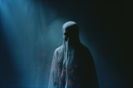 Mystical apparition of ethereal veiled figure in dark atmosphere.