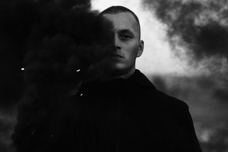 Portrait of a serious sad man in the smoke of a black smoke bomb close-up in a field. Black and white photo.