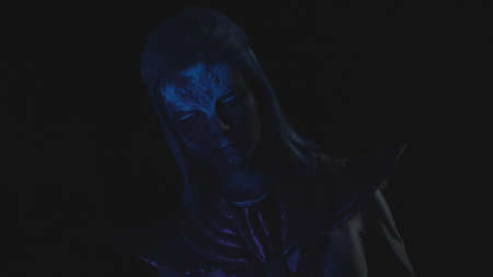 Alien with a glowing face looks at the camera in the dark