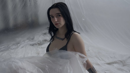 Female in underwear sitting on the bed in the studio. Young woman seminude in lingerie sits posing with thin sheet of oilcloth wrap, looks at camera.