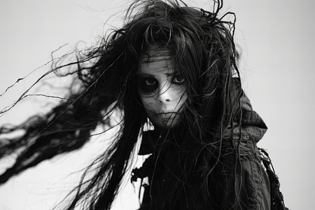 Digital artwork of black and white image of a woman with long hair and a scary mask