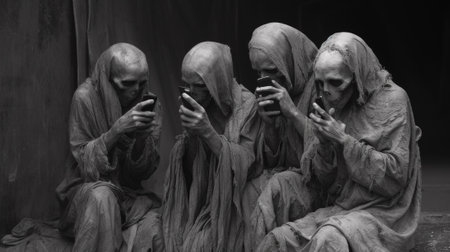 A group of three skeletons sitting in a row looking at their phones, AI