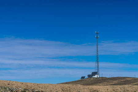Telecommunication tower against the blue sky, communication technology equipment