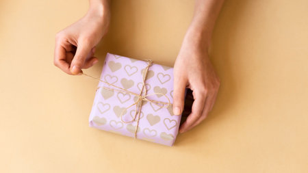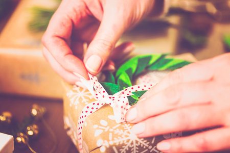 Top view woman's hands tying the ribbon on the gift. Handcraft present