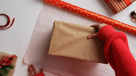 Top view of female hands wrapping a gift in brown paper and tying a red satin ribbon on a green background. Surrounded by Christmas decorations creating a cozy and festive holiday atmosphere.