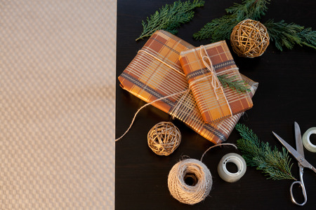 Wrapping Christmas gifts in recycled brown paper with vintage style at home.