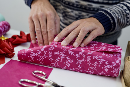 closeup of a young caucasian man wrapping a gift in a nice patterned pink paper, on a white table next to some ribbons of different colors