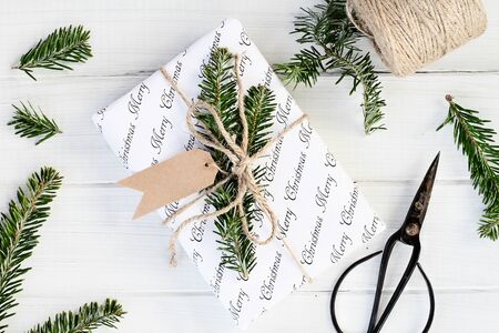 Christmas gift with blank tag. Decorated naturally with pine tree twigs and twine over a white background. Image shot from overhead.