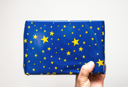Wrapped gift box featuring blue wrapping paper with yellow stars, held up against a light background.