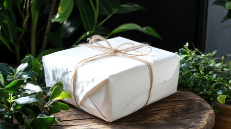 A beautiful gift wrapped in plain white paper tied with twine rests on a rustic wooden surface surrounded by vibrant greenery in natural light.