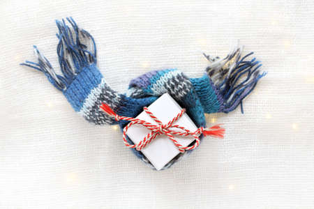 gift and knitted blue scarf on fabric with light lights top view. warming holiday surprise