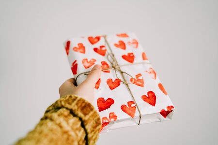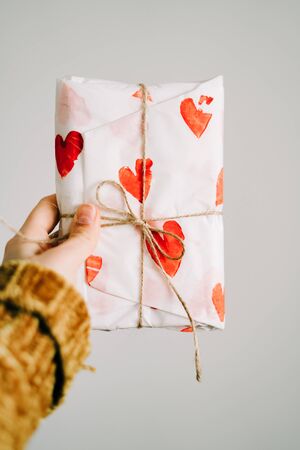 a cute gift in a woman's hand wrapped in homemade wrapping paper with black hearts tied with jute thread for Valentine's day