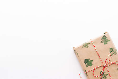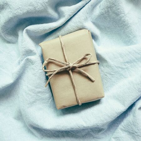 Cute gift box wrapped with craft paper top view. Gift for any holiday.