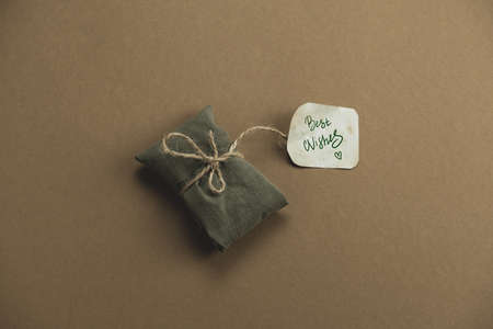 gift box wrapped in textile with label best wishes on a brown background