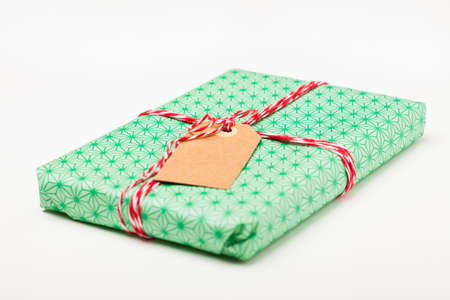Simple wrapped gift with plain cardboard tag on white background