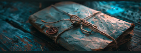 A vintage-styled parcel wrapped in brown paper and tied with twine, resting on a textured wooden surface, evoking a sense of mystery and nostalgia.