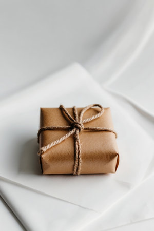 A minimalist kraft wrapped gift with a decorative fabric ribbon, placed on a soft textured surface, showcasing a serene and elegant presentation for special occasions