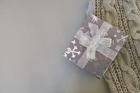 Christmas gifts, gray knitted blanket on gray background Copy space