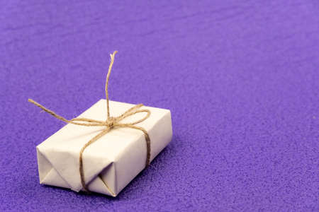 Gifts wrapped in white paper and tied with burlap rope, and colorful ribbons on a purple background. Free space for entering text