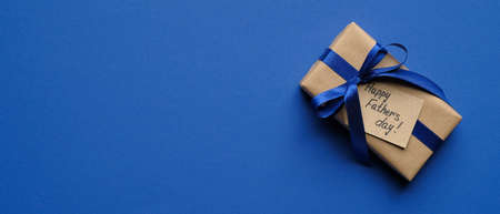 Happy Fathers Day banner template. Top view vintage gift box with label Happy Father's Day on blue background with copy space.
