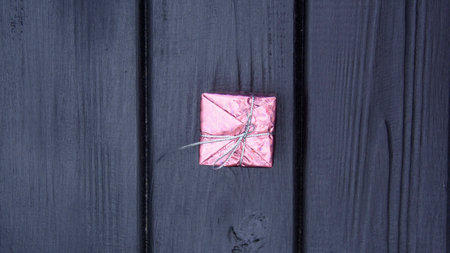 Gift box on a dark background. Top view with place for text