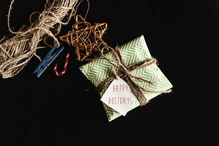 beautiful simple present in amazing green wrapping paper with greeting card, happy holidays text