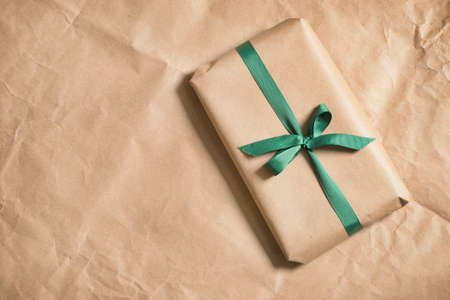 Tied gift package on brown craft paper background