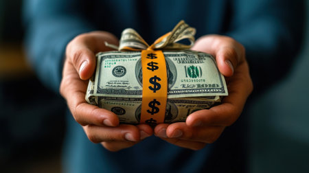 Hands present a neatly wrapped bundle of cash, symbolizing generosity at a giving occasion.