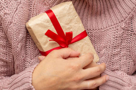 hands in a knitted sweater holding gift present box. Christmas holidays preparation concept