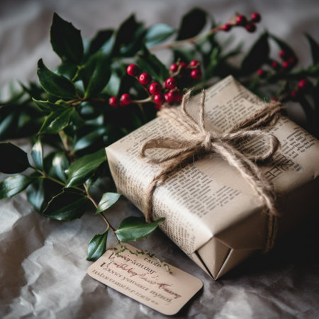 Beautifully wrapped gift featuring newspaper and twine, placed on a rustic wooden surface. emphasizes eco-friendly and sustainable gift-wrapping ideas, perfect for holiday celebrations, special occasions, and creative packaging designs.