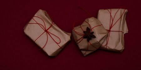 Kraft gift box with orange thread and labels for inscriptions on a red background. Packaging and preparation of gifts for the celebration. Christmas New Year backdrop