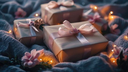 This enchanting image features beautifully wrapped gift boxes adorned with pink ribbons, surrounded by soft fabric and fairy lights, creating a warm atmosphere perfect for celebrations.