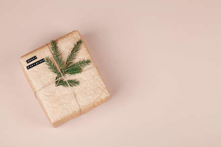 Christmas eco gift box with text and tree branch on beige background. Christmas zero waste. Flat lay, top view, copy space, banner.