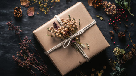 This stunning image showcases a beautifully wrapped gift adorned with dried flowers and natural accents, set against a dark wooden backdrop. Perfect for celebrations.