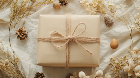 A beautifully wrapped gift with natural twine sits on soft fabric, surrounded by dried flowers and pine cones, creating a cozy, rustic holiday vibe.